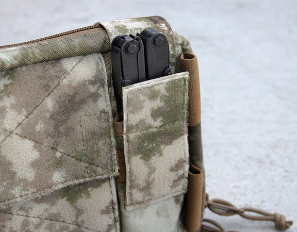 As a solution to the possibility of opening the pouch too far there is a .550 cord retention lanyard threaded through loops to keep the opened flap in place. This adjusts with a spring-loaded cord lock. I like this design since you can adjust how far the pouch will open with the cordlock. There is Velcro loop (in A-TACS on my custom version) on the inside lid to attach a nice, optional clear vinyl map pouch from Zulu Nylon Gear or patches. The main pocket has two deep elastic loop retainers mounted outside two levels of pockets. There is plenty of room for more pens, a small Moleskine or Rite in the Rain notebook, batteries, small electronics and other typical items you need in a hurry.