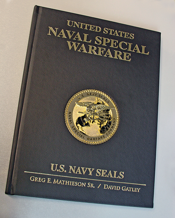 The cover of the book features a deeply and intricately embossed insignia of the Naval Special Warfare Command and the SEAL qualification badge, the Trident. It looks like something you’d see on a flag pole outside the Phil H. Bucklew Naval Special Warfare Center in Coronado, California.