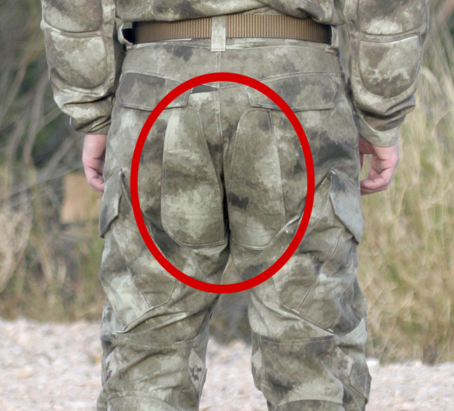 Two thin foam pads are built into panels at the rear of the pants over the "sit bones" for comfort while sitting on hard and cold surfaces.