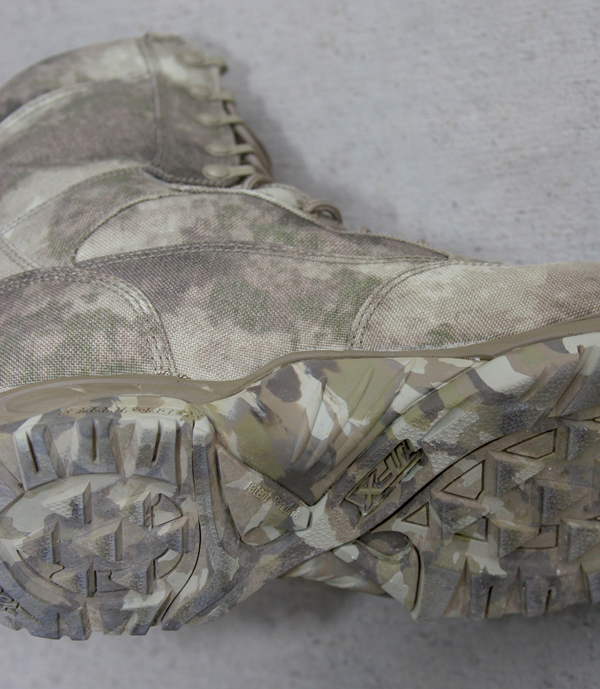 Another look at the camouflage sole. The boots are light and responsive on all terrain. They provide excellent protection and support considering their light weight.