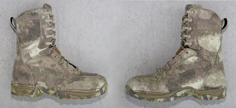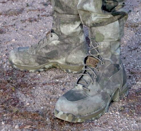 The A-TACS coloration of the outsole is slightly lighter in shade compared to the upper A-TACS camouflage colors. This is done on purpose since the sole will turn darker as wear and dirt accumulates. The concept of camouflaged boots including the sole is absolutely a valid one in the modern tactical environment. Older solid color boots were designed mostly with garrison wear in mind and don’t suit the modern tactical environment. Even the recent generation of green and coyote/tan color boots don’t blend well with camouflaged uniforms. Given the effectiveness of the new camouflage patterns like Multicam and A-TACS it’s only logical that footwear manufacturers build their boots to work with camouflaged uniforms for overall visual stealth. Even in the prone position the sole of the boot remains difficult to see since it is also camouflage patterned.
